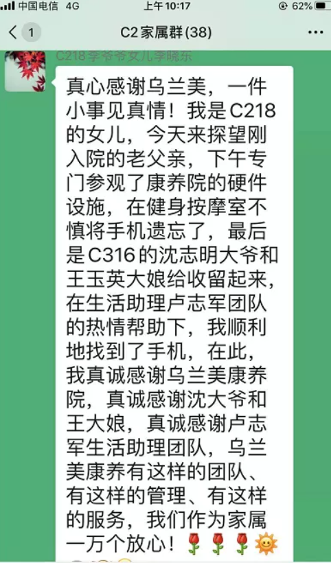 考慮到失主丟失財物焦急的心情,沈爺爺用餐過后便立即回到房間,正打算挨家挨戶找尋失主時,碰到了前來尋找手機的C區(qū)二樓生活助理團隊們。“真的特別謝謝大家的熱心幫助,當(dāng)烏蘭美的護士和生活助理人員知道我的手機丟失后,都自發(fā)的幫我找尋手機。我真的感到特別的暖心,特別的貼心。經(jīng)過這次事情,我對我老父親住在這里一萬個放心!因為這里的工作人員不僅細心呵護、照顧老人,還守護了他們的財產(chǎn)安全。”