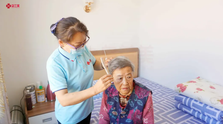 △烏蘭美養(yǎng)老護理員楊麗鮮正在為史玉玲奶奶梳頭
